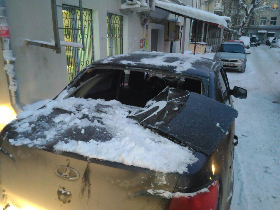 В Челябинске упавшая с крыши глыба льда разбила машину, в которой находились взрослый и ребенок